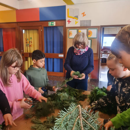 Mit viel Geduld, Geschick und Herzlichkeit zeigten sie den Kindern die Kunst des Adventkranzbindens. So entstanden in liebevoller Handarbeit wunderschöne Adventkränze, die unsere Klassen nun durch die Vorweihnachtszeit begleiten.